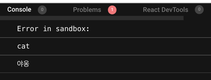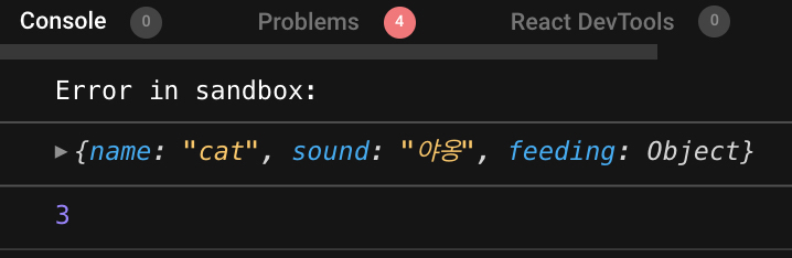 콘솔에 name과 sound를 각각 찍어보면 cat 객체의 요소인 "cat"과 "야옹"이 담긴 걸 확인할 수 있다.